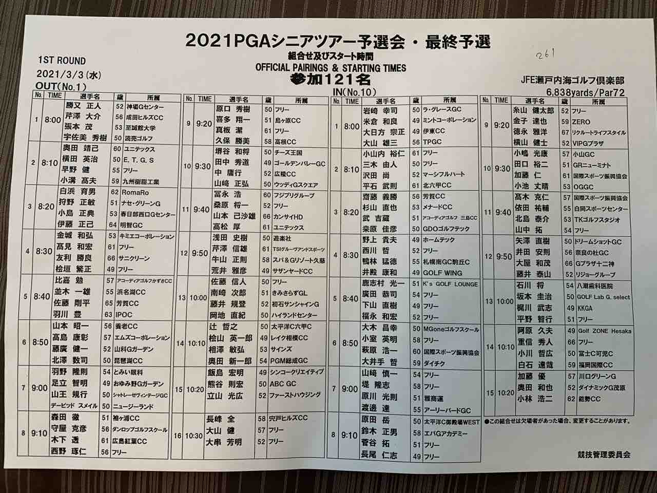 PGAシニアツアー予選会 最終予選 2021年03月02日 明日から3日間、JFE瀬戸内海ゴルフクラブでシニアツアーの最終予選が行なわれます。参加121名。10以内に入れば全試合出れるでしょう。狭き門です。明日の組み合わせ表年齢がのっている(笑)67歳で1次予選を通過してきてる人がいる(゚o゚;凄いな。頑張ります。終わり。 < 前の記事次の記事 > コメント コメントフォーム 名前 コメント 記事の評価 リセット リセット 顔 星 情報を記憶 コメントを投稿する